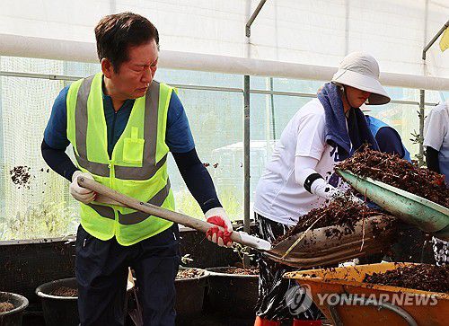 (나주=연합뉴스) 조남수 기자 = 더불어민주당 정청래 당 대표 후보가 22일 전남 나주시 다시면의 한 블루베리농장에서 수해 복구 작업하고 있다. 2025.7.22