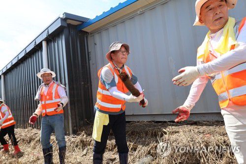 (예산=연합뉴스) 김준범 기자 = 국민의힘 송언석 비대위원장 겸 원내대표를 비롯한 당 관계자들이 22일 충남 예산군 삽교읍 수해 현장을 찾아 복구 작업을 하고 있다. 2025.7.22
