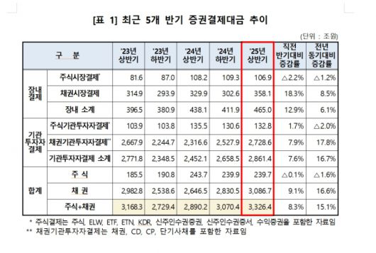 장내 시장 결제 동향을 살펴보면 올해 상반기 장내 주식시장 결제 대금은 106조9000억원을 기록하며 직전 반기(109조3000억원) 대비 2.2% 줄었다.