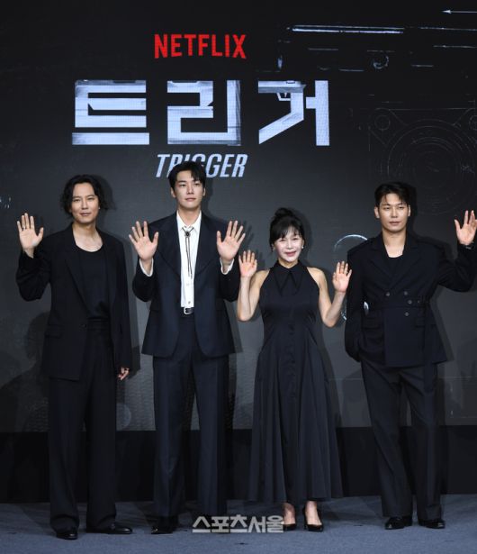 22일 서울 마포구 호텔나루 서울 엠갤러리에서 열린 넷플릭스 시리즈 ‘트리거’ 제작발표회에서 출연 배우들이 취재진을 향해 포즈를 취하고 있다. 왼쪽부터 배우 김남길, 김영광, 길해연, 박훈.