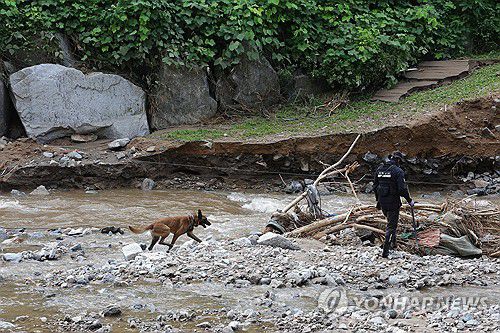 (가평=연합뉴스) 임병식 기자 = 22일 경기도 가평군 조종면 마일리에서 경찰이 탐지견으로 실종자 수색 작업을 벌이고 있다. 2025.7.22