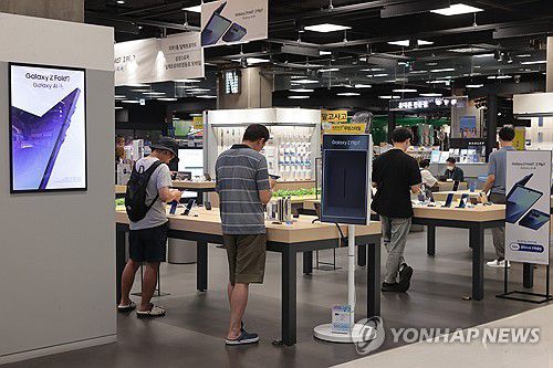 (서울=연합뉴스) 류효림 기자 = 이동통신 3사가 22일부터 최신 폴더블폰 '갤럭시 Z 폴드7·플립7' 사전 예약 고객을 대상으로 개통을 시작했다. 이날 서울 시내 대형마트 가전매장에서 시민들이 최신 폴더블폰 '갤럭시 Z 폴드7·플립7'을 살펴보고 있다. 2025.7.22