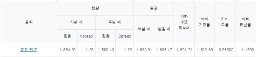 같은 시각 시세 정보에 따르면, 현찰로 유로를 살 때는 1,654.95원, 팔 때는 1,590.37원이며, 송금 시에는 보낼 때 1,638.88원, 받을 때 1,606.44원이 적용된다.