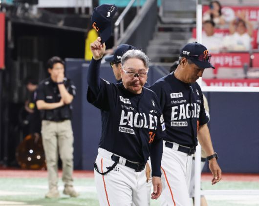 지난 20일 경기도 수원케이티위즈파크에서 열린 2025 KBO리그 프로야구 한화 이글스와 kt wiz의 경기. 10-0으로 승리한 한화 김경문 감독이 경기가 끝난 후 팬들에게 인사하고 있다. 연합뉴스 |