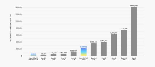 회사 측에 따르면, 해당 모델은 140억 개 파라미터 규모의 모델임에도 불구하고, 5억 개 파라미터로 구성된 글로벌 오픈소스 모델보다 더 적은 비용(GPU Hours)으로 학습됐다. 동일 크기 글로벌 오픈소스 모델과 비교하면 1회 학습 비용은 약 100분의 1 수준이다.