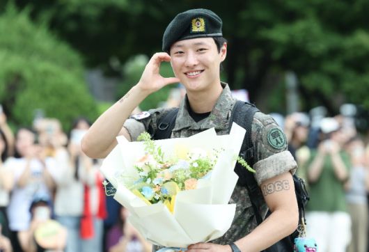 가수 우즈(WOODZ, 본명 조승연)가 21일 오전 서울 노원구 육군사관학교에서 전역식을 마친 뒤 전역인사를 하고 있다. 2025.7.21 뉴스1 |