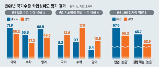 하위권 학생들에게서도 지역 간 격차가 두드러졌다. 국어 기초학력 미달인 중3 학생은 대도시에서 8.2%였지만, 읍면 지역에선 13.8%였다. 대도시에선 국어 기초학력 미달이 2022년 11.5%에서 3년간 감소해 2024년 8.2%를 보였다. 반면 읍면 지역에선 2022년 15.8%, 2023년 8.9%, 2024년 13.8%로 다시 반등했다. 대도시에선 수학 기초학력 미달인 중3 학생이 2022년 11.4%에서 2024년 9.7%로 줄었으나, 읍면 지역에선 같은 기간 17.3%에서 17.9%로 소폭 늘어났다.