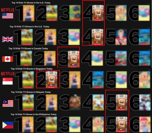 지난 14일 기준, 넷플릭스 집계에 따르면 ‘브레드이발소 시즌4’는 ▲미국 4위 ▲영국 4위 ▲캐나다 3위 ▲호주 5위 ▲아일랜드 4위 ▲싱가포르 2위를 기록했다. 특히, 영어권 국가를 중심으로 한 고른 인기와 더불어, ▲필리핀 ▲말레이시아 ▲인도 등 동남아시아에서도 5~7위권에 올라 글로벌 흥행력을 입증했다.
