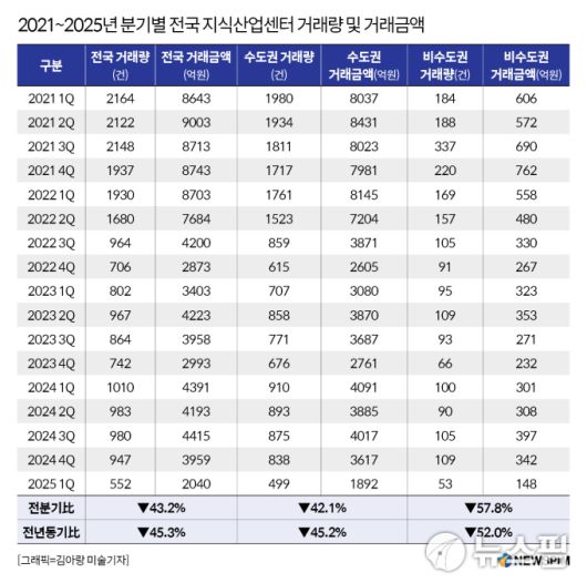2021~2025년 전국 지식산업센터 거래량 및 거래금액 변동 추이. [그래픽=김아랑 미술기자] |