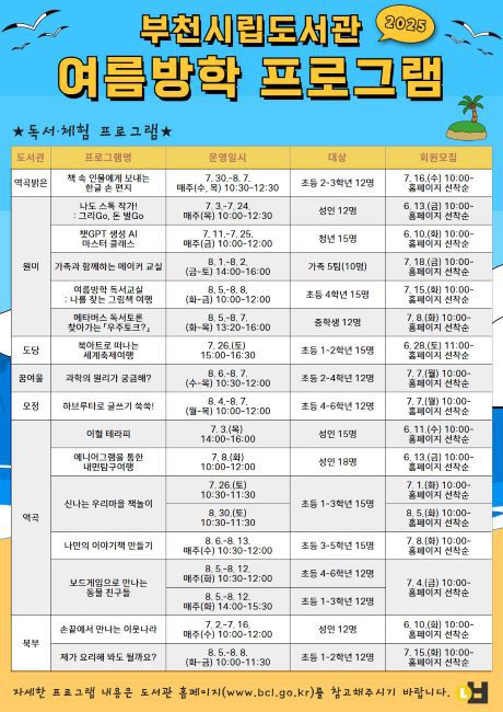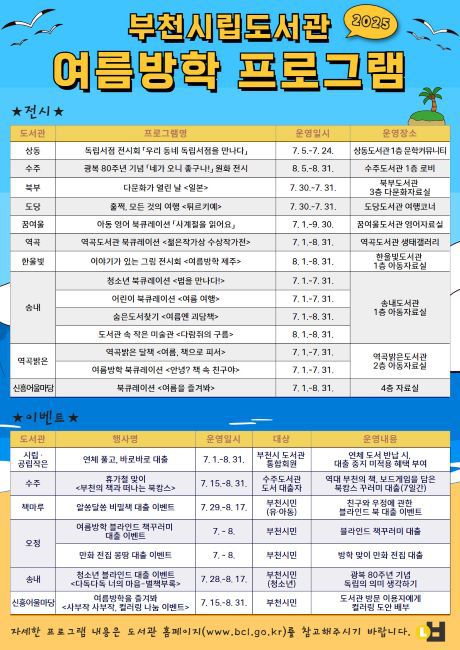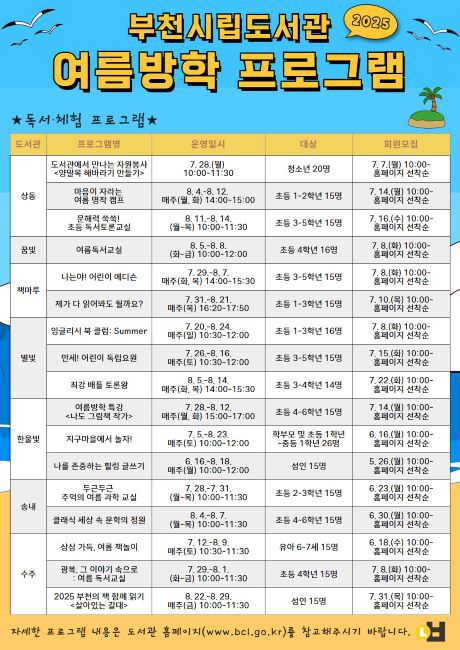 도서관별 주요 프로그램은 △상동=마음이 자라는 여름 명작 캠프 △별빛마루=잉글리시 북 클럽:Summer △수주=상상 가득, 여름 책놀이 △꿈빛=여름 독서 교실 △원미=가족과 함께하는 메이커 교실 △도당=북아트로 떠나는 세계축제 여행 △송내=두근두근 추억의 여름 과학 교실 △꿈여울=과학의 원리가 궁금해? △오정=하브루타로 글쓰기 쑥쑥! △역곡=보드게임으로 만나는 동물 친구들 등이다.