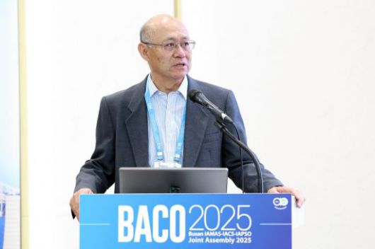 주통(Zhu Tong) 베이징대학교 환경과학공학대학 교수가 22일 부산 벡스코에서 '2025 국제 측지학 및 지구물리학 연합(IUGG) 산하 기상·해양·빙권 국제학술대회(BACO-25)' 기조 강연을 하고 있다. BACO-25 조직위원회 제공 |