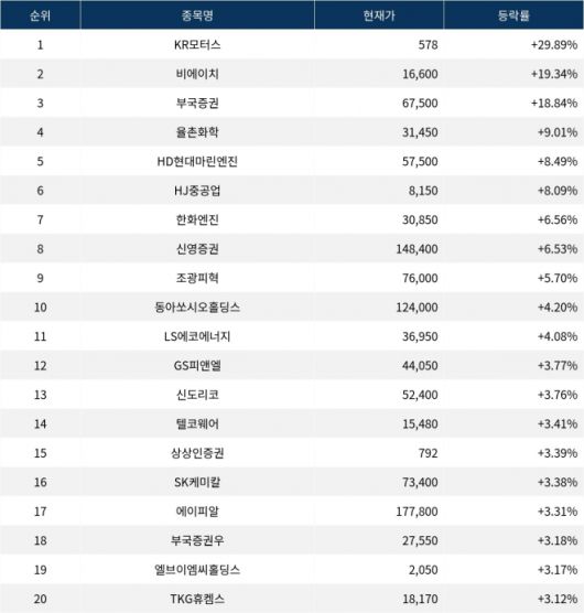 6위 HJ중공업(097230)은 종가 8,150원으로 8.09% 상승 마감했다. 7위 한화엔진(082740)은 종가 30,850원으로 6.56% 상승 마감했다. 8위 신영증권(001720)은 종가 148,400원으로 6.53% 상승 마감했다. 9위 조광피혁(004700)은 종가 76,000원으로 5.70% 상승 마감했다. 10위 동아쏘시오홀딩스(000640)는 종가 124,000원으로 4.20% 상승 마감했다.