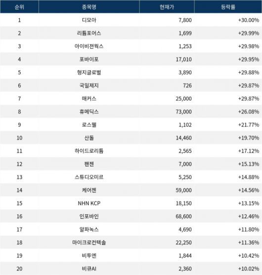 6위 국일제지(078130)는 종가 726원으로 29.87% 급등 마감했다. 7위 매커스(093520)는 종가 25,000원으로 29.87% 급등 마감했다. 8위 휴메딕스(200670)는 종가 73,000원으로 26.08% 급등 마감했다. 9위 로스웰(900260)은 종가 1,102원으로 21.77% 급등 마감했다. 10위 산돌(419120)은 종가 14,460원으로 19.70% 급등 마감했다.