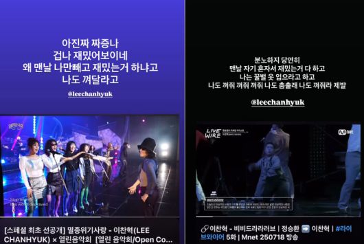 이어 Mnet ‘라이브 와이어’ 출연 장면 중, 자유롭게 춤을 추며 무대를 즐기는 이찬혁의 모습이 담긴 영상을 올리고, “분노하지 당연히. 맨날 자기 혼자서 재밌는 거 다 하고, 나는 꿀벌 옷 입으라고 하고. 나도 껴줘 껴줘 껴줘. 나도 춤출래. 나도 껴줘라 제발”이라며 재치 있는 글로 누리꾼들의 웃음을 자아냈다.