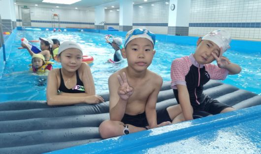 KCC 임직원 가족들이 서울 서초구 본사 지하 사내 수영장에서 물놀이를 즐긴 뒤 사진을 찍고 있다./KCC |