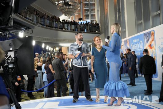 [로스앤젤레스=AP/뉴시스] 배우 바네사 커비(오른쪽)가 21일(현지 시간) 미 캘리포니아주 로스앤젤레스의 도로시 챈들러 파빌리온에서 열린 영화 '판타스틱 4: 새로운 출발' 시사회에 참석해 인터뷰하고 있다. 커비는 교제 중인 전 라크로스 선수인 폴 라빌과의 사이에서 첫 아이를 임신 중이다. 2025.07.22.