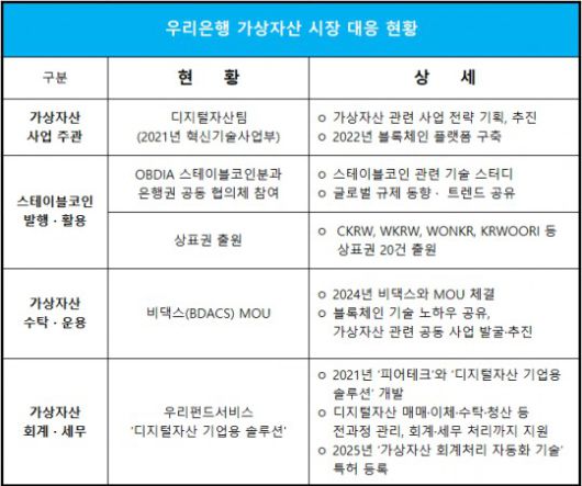 우리은행은 법제화가 완료될 경우 디지털자산팀을 중심으로 즉시 관련 비즈니스를 진행할 방침이다.
