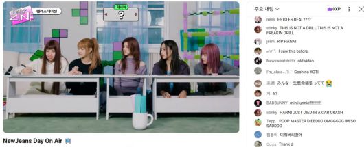 그룹 뉴진스가 3주년을 맞은 가운데, 비하인드 콘텐츠 스트리밍 이벤트 중이다. 이 스트리밍은 약 850여 명이 시청하고 있다. 댓글창은 영어가 대부분이고, 일본어, 한국어 순으로 이따금씩 올라오고 있다.