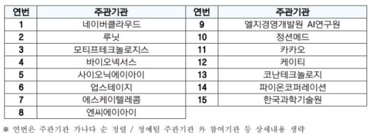 과학기술정보통신부에 따르면 프로젝트 지원이 마감된 21일 기준, 총 15개의 기업이 주관사로 이름을 올렸다. 국내 대기업으로는 네이버클라우드, SKT, NC AI, LG AI연구원, 카카오, KT 등이 있으며 대부분 참여가 예상됐던 기업이다. AI 전문 스타트업으론 업스테이지와 코난테크놀로지, 의료 AI 영역의 루닛 등이 눈에 띈다. 학계에선 국내 AI 연구 대표주자로 꼽히는 KAIST(한국과학기술원)가 참여하기로 했다.