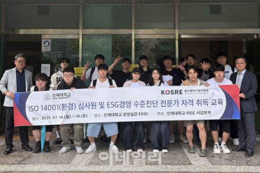 [이데일리 김태형 기자] 중소벤처기업인증원(원장 엄진엽, KOSRE)은 지난 14일부터 19일까지 6일에 걸쳐 인제대학교 RISE사업본부(본부장 김범근)와 협업해 ‘ISO 14001(환경경영시스템) 인증심사원 및 ESG 경영 수준진단 전문가 양성과정’을 진행했다고 밝혔다.