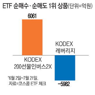 22일 금융투자업계에 따르면 코스피가 상승세를 탄 6월 2일부터 7월 21일까지 개인은 KODEX 200선물인버스2X를 6061억원어치 순매수했다. 이 기간 유가증권시장은 연일 급등했고 KODEX 200선물인버스2X는 34거래일 중 25거래일이나 하락했다.