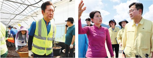 정청래 더불어민주당 당 대표 후보가 22일 전남 나주시 다시면의 한 블루베리농장에서 수해 복구 작업하고 있다. /연합 박찬대 더불어민주당 당 대표 후보가 22일 전남 곡성군 곡성읍 대평리에서 수해 피해 농장주와 대화하고 있다. /연합 |