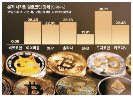 알트코인 중에선 XRP가 먼저 움직였다. 지난 18일 XRP는 세계 최대 거래소 바이낸스에서 3.66달러까지 오르면서 올해 1월 16일 기록한 역대 최고가를 183일 만에 넘어섰다. 이후 지난 20일엔 이더리움이 3700달러를 돌파하면서 연중 최고가를 경신했다. 이처럼 알트코인 장세는 XRP와 이더리움이 먼저 주도했지만 이날 온기가 솔라나까지 확산됐다.