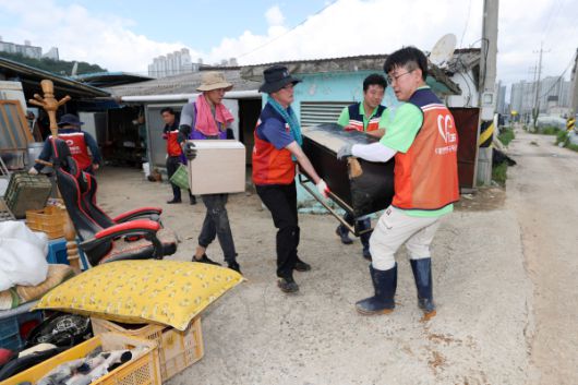 광산구 수해복구 활동 사진. 22일 자원봉사자들이 광산구 신창동에 있는 신기마을의 수해피해복구를 돕고 있다. [사진=광주광역시 광산구] |