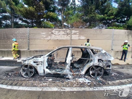 중부내륙고속도로를 달리다 화재가 발생해 전소된 SUV차량.(괴산소방서 제공, 재판매 및 DB금지)/뉴스1 |