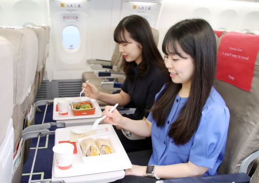 티웨이항공 탑승객이 장거리 노선에서 제공되는 순수 채식 기내식 메뉴인 '양배추롤과 토마토 쿨리소스'와 '당근 라페 랩'을 맛보고 있다. |