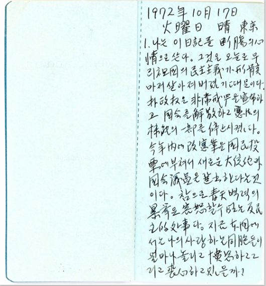 "나는 이 일기를 단장(斷腸)의 심정으로 쓴다. 그것은 오늘로 우리 조국의 민주주의가 형해(形骸)마저 사라져버렸기 때문이다. 박정희 정권은 비상계엄을 선포하고 국회를 해산하고 헌법 기능의 일부를 정지시켰다 (중략) 참으로 청천벽력의 폭거요, 용서할 수 없는 반민주적 처사이다. 지금 본국에서는 나의 사랑하는 동포들이 얼마나 놀라고 분노하고 상심하고 있을까."