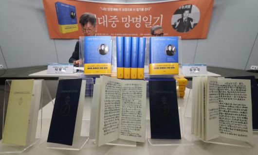 김대중 전 대통령이 6권의 수첩에 적은 일기가 22일 서울 마포구 연세대 김대중도서관에서 열린 '김대중 망명일기' 출간 기자간담회에 놓여 있다. 연합뉴스 |