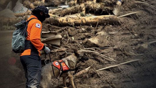 오늘 오후 4시 10분쯤, 경남 산청군 단성면 방목리에서 산사태 피해 지역에 매몰됐던 60대 추정 여성 실종자를 경찰 수색견이 확인했습니다.