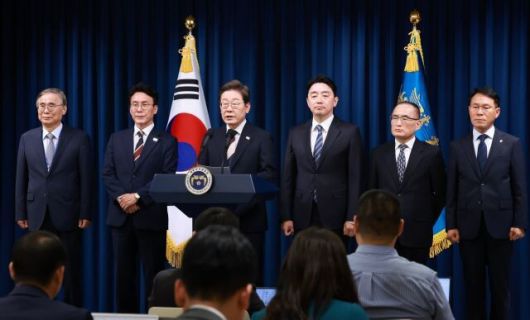 지난 6월4일 이재명 대통령이 이종석 국가정보원장 후보자(맨 왼쪽) 지명 사실을 발표하고 있다. 대통령실 사진기자단 |