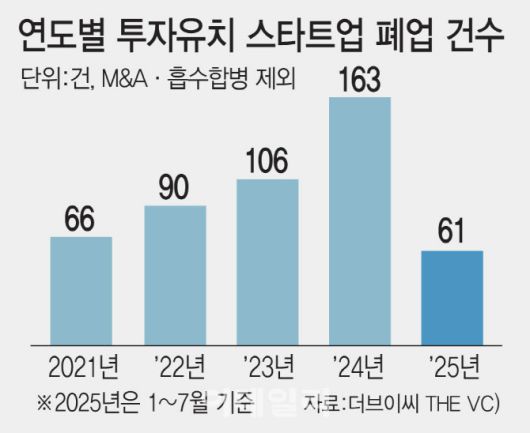 22일 벤처투자 플랫폼 더브이씨에 따르면, 2024년 한 해 동안 투자 유치 이력이 있는 스타트업 중 폐업한 기업은 총 163곳으로 전년 대비 53.8% 증가했다. 폐업 기업수는 2021년 66곳, 2022년 90곳, 2023년 106곳에 이어 작년에 사상 최대치를 경신한 것이다. 올들어 이날까지 폐업은 61건으로 하반기 고금리 지속, 경기 악화 등이 이어질 경우 또 한번 최고 기록을 갈아치울 공산이 크다.