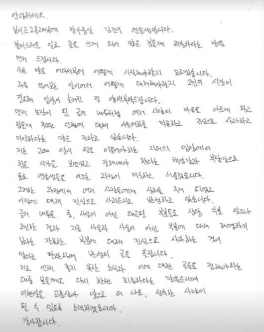 편지에서 김건우는 "불미스러운 일로 글을 쓰게 돼 많은 분들께 죄송하다"며 "처음 겪어보는 일이라 어떻게 대처해야 할지 몰라 고민이 필요했다"며 말문을 열었다.