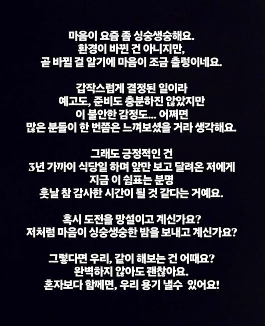 이기용은 지난 21일과 22일 자신의 SNS에 “마음이 요즘 좀 싱숭생숭해요. 환경이 바뀐 건 아니지만, 곧 바뀔 걸 알기에 마음이 조금 출렁이네요”라며 장문의 글을 게재했다.