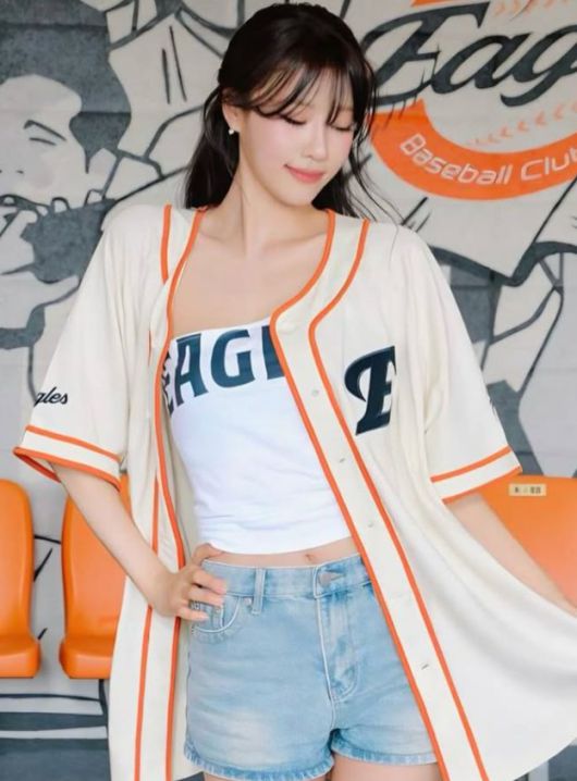 사진 속 이미주는 아이보리 컬러의 야구 유니폼과 밝은 청색 데님 숏팬츠를 매치한 스타일로 등장했다.