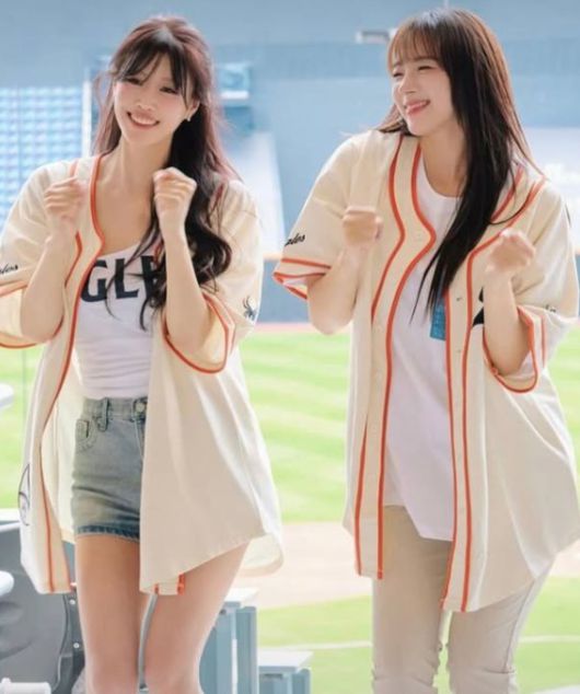 같은 날 야구장에 방문한 또 다른 여자 아이돌 멤버는 크림 컬러에 오렌지 라인이 포인트로 들어간 오버핏 유니폼 셔츠를 활용해 활동성과 스타일을 모두 살린 캐주얼한 응원 룩을 선보였다.