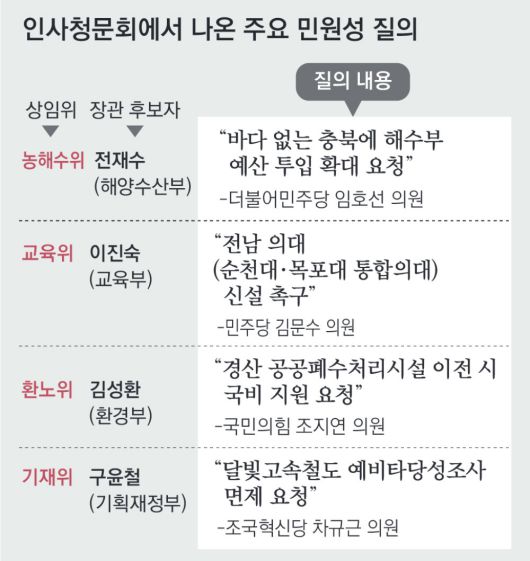 더불어민주당 임호선 의원(충북 증평-진천-음성)은 전재수 해양수산부 장관 후보자 청문회에서 “민물 낚시하는 분들이 가장 많이 찾는 곳이 충북임을 꼭 잊지 말고 챙겨 달라”며 예산 지원을 요구했다. 같은 당 김영진 의원(경기 수원병)은 구윤철 경제부총리 겸 기획재정부 장관 후보자에게 지역구를 지나는 GTX 노선 사업 진척을 요청했다. 국민의힘 조지연 의원(경북 경산)은 김성환 환경부 장관 후보자에게 지역구와 연관된 폐수처리시설 이전을 꺼냈고, 조국혁신당 차규근 의원(비례)은 자신이 시당위원장인 대구로 연결되는 고속도로 사업의 예비타당성 조사 면제를 구 후보자에게 대놓고 부탁했다.