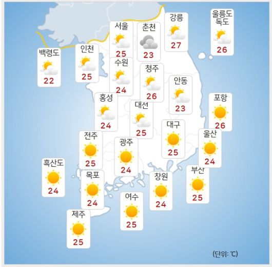 최고기온은 △서울 33도 △인천 30도 △춘천 32도 △강릉 33도 △대전 34도 △대구 35도 △전주 35도 △광주 35도 △부산 32도 △제주 32도 △울릉도 독도 31도로 예상된다.