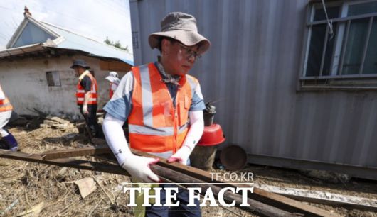 여야가 앞다퉈 수해 현장을 찾아 복구 작업에 집중하고 있다. 사진은 송언석 국민의힘 비상대책위원장이 22일 충남 예산군 삽교읍 하포리2구에서 수해복구 봉사활동을 하는 모습. /뉴시스 |