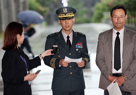 김용대 드론작전사령관이 17일 오전 서울 서초구 서울고등검찰청에 마련된 내란특검 사무실에 무인기 침투 의혹 등 외환 혐의 관련 조사를 받기 위해 출석하며 입장을 밝히고 있다./뉴스1 |
