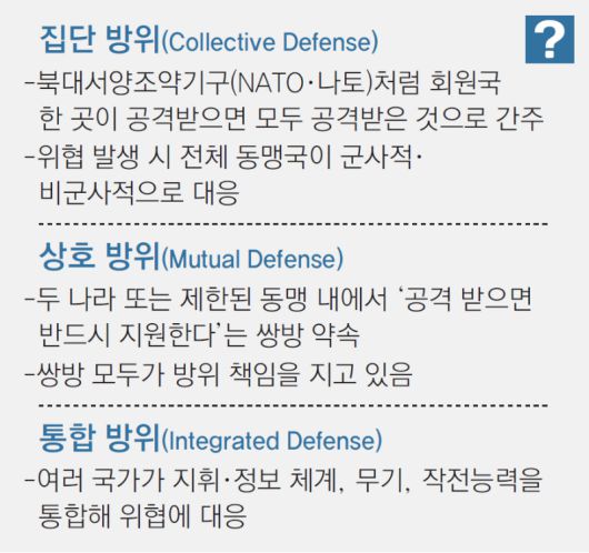 콜비 차관이 언급한 ‘집단 방위’는 여러 국가가 연합해 방어체계를 구축하고, 한 회원국이 공격을 받으면 전체 동맹이 공동 대응하는 구조다. 실제로 나토 헌장 5조에는 한 회원국에 대한 무력공격을 전체에 대한 공격으로 간주한다는 집단 방위 규정이 명시돼 있다.