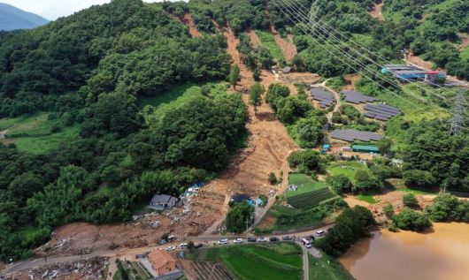 지난 19일 폭우로 인해 일어난 산사태로 인명피해가 발생한 경남 산청군 산청읍 부리마을의 모습. 연합뉴스 |