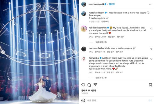 카르도소는 23일(한국시간) 자신의 누리소통망(SNS)에 결혼반지를 끼고 조타와 맞잡은 오른손 사진을 올리면서 "죽음이 우릴 갈라놓은 지도 1달이 흘렀다"고 적었다.