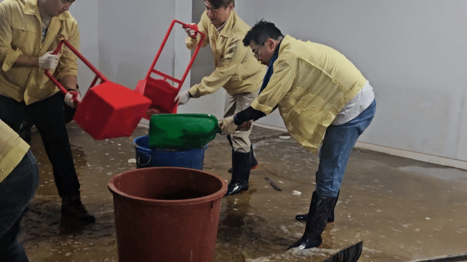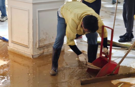 21일 광주 서구의 한 가구점 지하 1층. 더불어민주당 대표 선거 운동을 중단하고 수해 복구 지원에 나선 박찬대 후보가 자진해서 흙탕물 속으로 뛰어들었다.