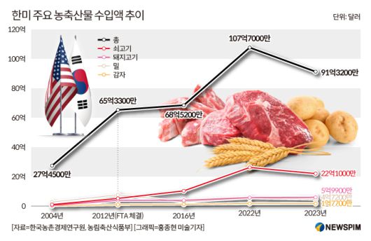 미국산 쇠고기 수입액은 지난 2004년 1억300만달러에서 2012년 5억2200만달러, 2016년 10억3500만달러로 20억달러를 넘기다 2022년에는 26억2400만달러로 역대 최대치를 기록했다. 지난해까지의 연평균 증가율은 17.5%다.