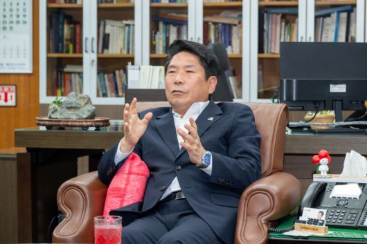 뉴프핌과 인터뷰 하는 김창규 제천시장. [충북=뉴스핌] 백운학 기자 = 2025.07.22 baek3413@newspim.com |