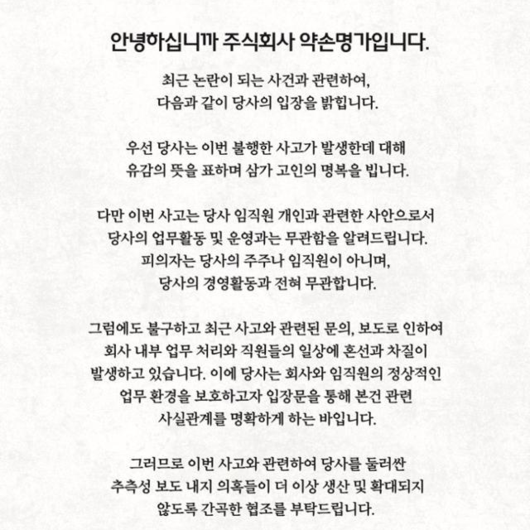 그러면서 지나친 억측은 자제해 달라고 호소했다. 약손명가는 "최근 사고와 관련된 문의, 보도로 인해 회사 내부 업무 처리와 직원들의 일상에 혼선과 차질이 발생하고 있다"며 "당사를 둘러싼 추측성 보도 내지 의혹들이 더 이상 생산·확대되지 않도록 간곡한 협조를 부탁한다"고 당부했다. 아울러 "이번 사고와 관련해 더 이상의 불필요한 오해나 확대 해석이 발생하지 않기를 바라며, 피해자의 유족인 당사 임원 또한 추가적인 사회적 소란이나 제3의 피해가 발생하지 않기를 간절히 바라고 있다"고 덧붙였다.